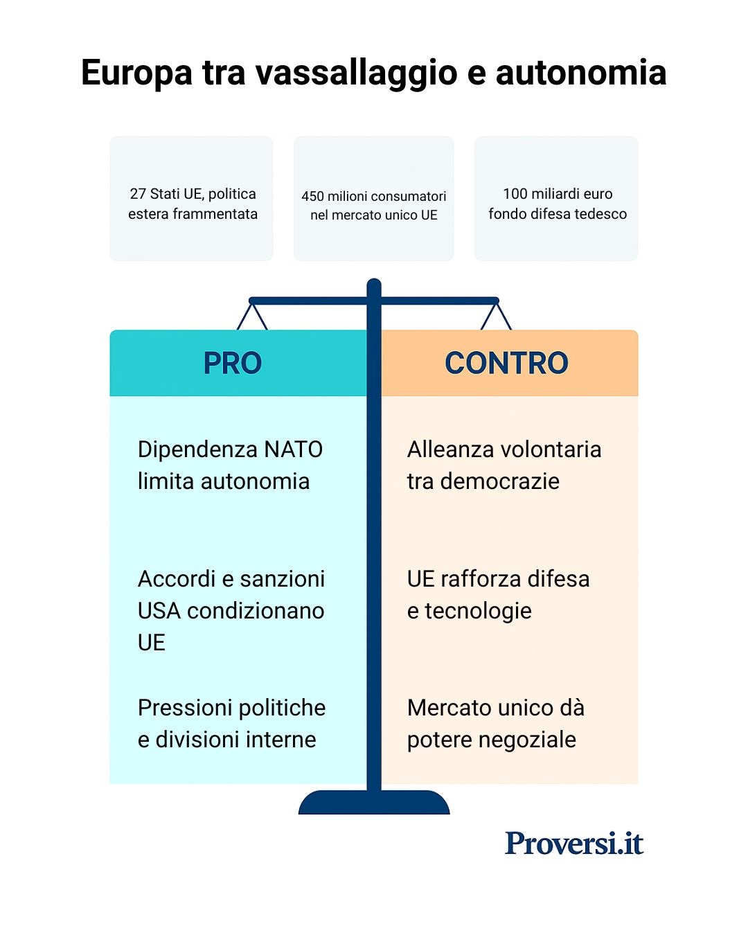 Le conseguenze di questa dipendenza si notano anche nel peso politico dell’Europa nelle crisi. Negoziati cruciali – per esempio colloqui di pace sulla guerra russo-ucraina – vedono l’UE relegata a ruoli secondari o esclusa del tutto, mentre Washington tratta direttamente con Mosca (o con Pechino). Come sintetizzato dall’editoriale di “El Mundo”, “da ora in poi spetterà all’UE garantire la propria sicurezza… le luci [americane] si stanno spegnendo”, segno che gli Stati Uniti intendono ridimensionare il proprio impegno difensivo in Europa, lasciando il Vecchio Continente a fare i conti con le proprie insufficienze. In questa nuova realtà, se l’Europa non riuscirà a colmare il gap militare, finirà per accettare qualunque condizione pur di mantenere la protezione USA, a costo di confermare esattamente quel rapporto “sovrano-vassallo” che si vorrebbe evitare. È, dunque, un circolo vizioso: meno l’Europa investe in difesa autonoma, più diventa militarmente subalterna; e più è subalterna, meno è in grado di prendere decisioni indipendenti, consolidando uno status di vassallaggio nei fatti se non nel nome.