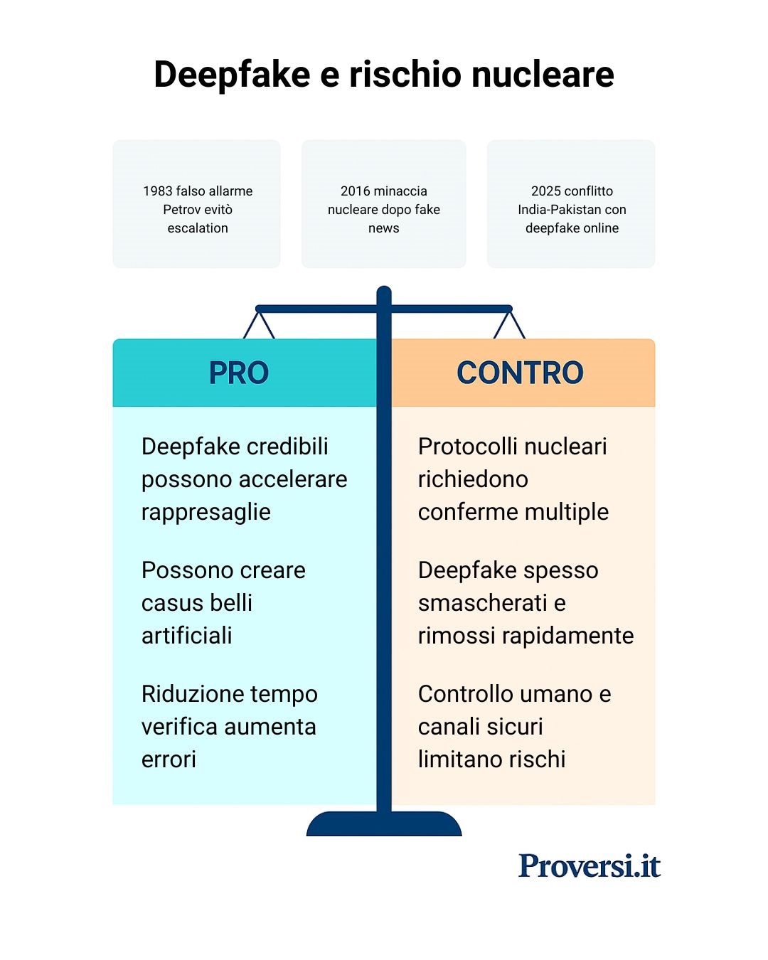 In molti sostengono che un deepfake realistico potrebbe ingannare i sistemi d’allarme e i leader, scatenando un lancio nucleare per errore. Nei moderni protocolli “launch-on-warning” delle superpotenze, i comandanti hanno pochi minuti per reagire a un allarme missilistico: un video contraffatto, ad esempio in cui il presidente avversario annuncia un attacco atomico, potrebbe indurre una risposta immediata prima che la falsità venga scoperta. L’ex presidente USA Donald Trump ha descritto proprio uno scenario simile, chiedendo a Elon Musk se un Capo di Stato avrebbe modo di verificare in tempo reale l’autenticità di un video simile; la risposta sarebbe stata che “non c’è alcun modo”. Un caso storico emblematico evidenzia la gravità del problema: nel 1983 l’ufficiale sovietico Stanislav Petrov ignorò un allarme automatico (che segnalava erroneamente missili in arrivo) evitando una catastrofe. Se Petrov avesse seguito il computer – come potrebbe accadere a futuri “Petrov digitali” di fronte a un deepfake ben orchestrato – l’URSS avrebbe lanciato testate nucleari contro un attacco inesistente. Gli esperti notano che, quando un filmato manipolato di un presunto attacco diventa virale, i leader subiscono un’enorme pressione a “fare qualcosa” immediatamente, anche senza aver verificato i fatti. Un falso convincente, diffuso nei convulsi minuti iniziali di una crisi, rischia quindi di innescare la spirale escalation–rappresaglia tipica della deterrenza nucleare, stavolta però basata su un’illusione tecnologica creata ad arte.