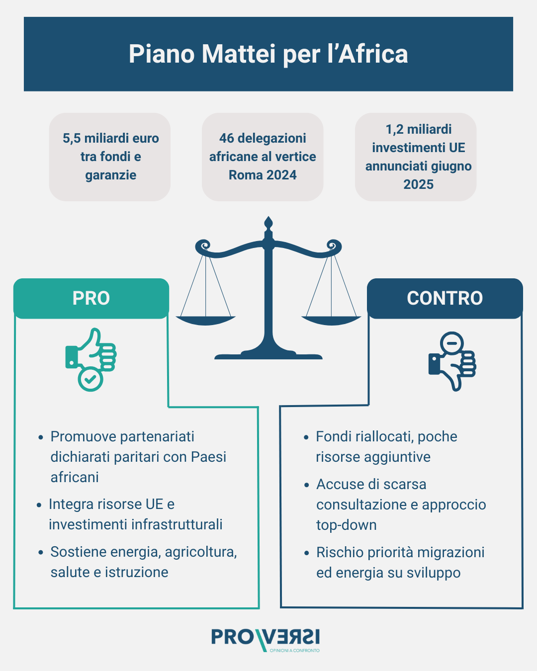 In definitiva, il Piano Mattei conviene a tutti: agli africani che ricevono investimenti e non lezioni; agli italiani che guadagnano sicurezza energetica, nuovi mercati e meno sbarchi; agli europei che trovano nell’Italia un facilitatore verso un rapporto paritario con il continente vicino (superando l’eredità coloniale). L’Italia, in particolare, riempie un vuoto di leadership positiva nel Mediterraneo: torna a essere promotrice di sviluppo e stabilità, recuperando prestigio internazionale. In un colpo solo, sostiene chi è favorevole, si realizzano i principi etici di solidarietà e gli interessi nazionali – dimostrando che non sono in contraddizione, ma anzi possono avanzare di pari passo attraverso la cooperazione.