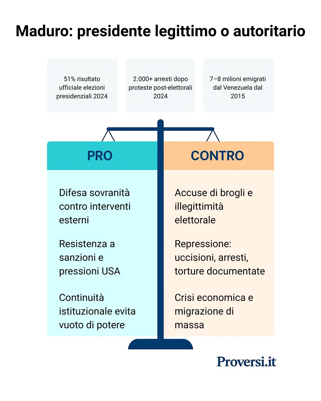 Un argomento pro-Maduro, meno idealista e più pragmatico, sostiene che la sua permanenza al potere – pur con tutti i problemi – abbia assicurato una certa stabilità istituzionale ed evitato scenari di caos e che un cambiamento avrebbe dovuto avvenire per via negoziale e pacifica anziché traumatica. Secondo questa tesi, l’“uscita di forza” di Maduro rischia di peggiorare la situazione del Venezuela invece di migliorarla, mentre la strategia perseguita da Maduro di un dialogo controllato con l’opposizione stava aprendo spiragli per un’evoluzione interna più ordinata.